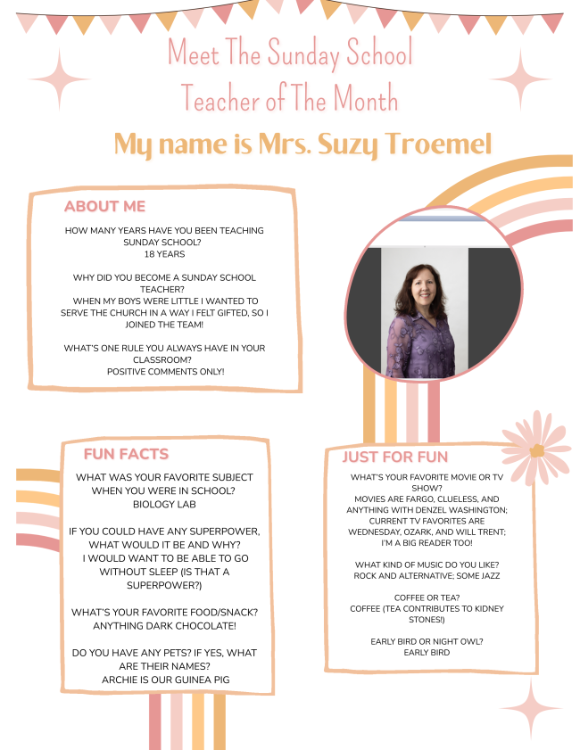 Overview: Elementary kids dive into engaging Bible stories, hands-on activities, and interactive lessons that help them understand how faith connects to their everyday lives. Click HERE to read the Curriculum Corner to see what the Sunday School kids are up to this month! Click HERE to meet February’s SS Teacher of the Month.